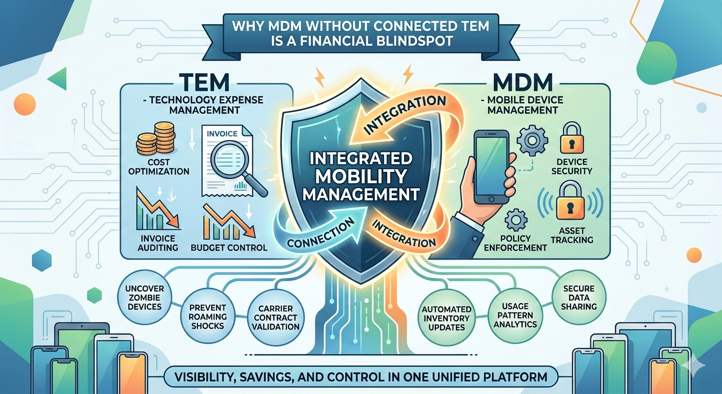 When these two worlds don’t talk, your organisation operating with one eye closed. The “Operational” eye (MDM) knows exactly where a phone is and what apps it’s using. But the “Financial” eye (TEM) is left staring at a stack of line-item-laden carrier invoices, trying to figure out why the data bill changed or who the device and service belong to.